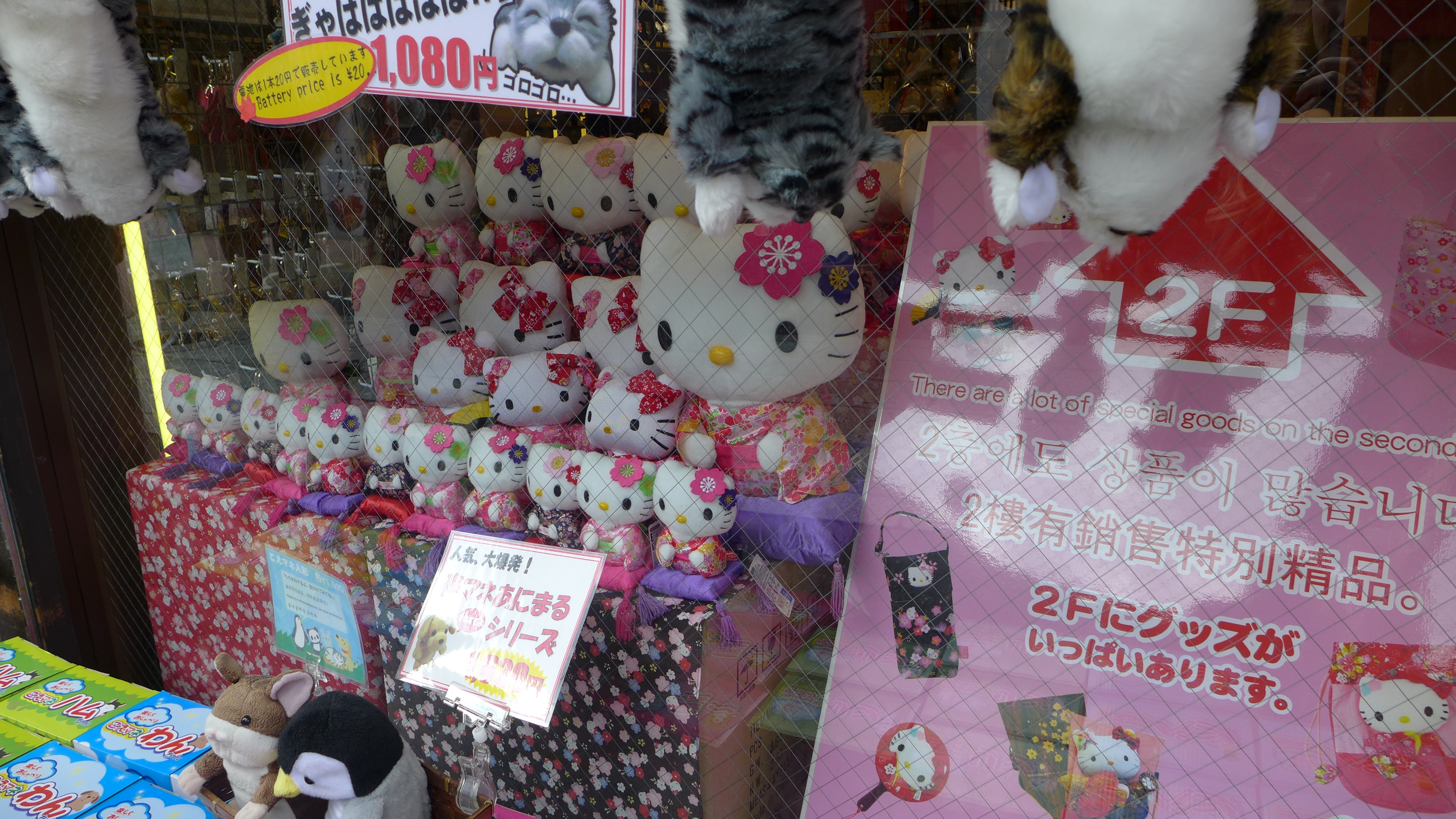 The closest train station is Fushimi-Inari station on the Keihan line (there is also a JR station nearby) so access is pretty easy. We walked from the station towards the shrine, passing a lot of souvenir shops, sweet shops and even a cat cafe (yes those are actually a thing). As you approach the shrine there are no more cars and the streets are lined with shops and street vendors, including an entire shop dedicated to Hello Kitty which had some terrifying cat toys that moved when you squeezed them hanging from their tails outside. (Note: when I went back a week later the hello kitty shop was boarded up – it seems it went out of business!)