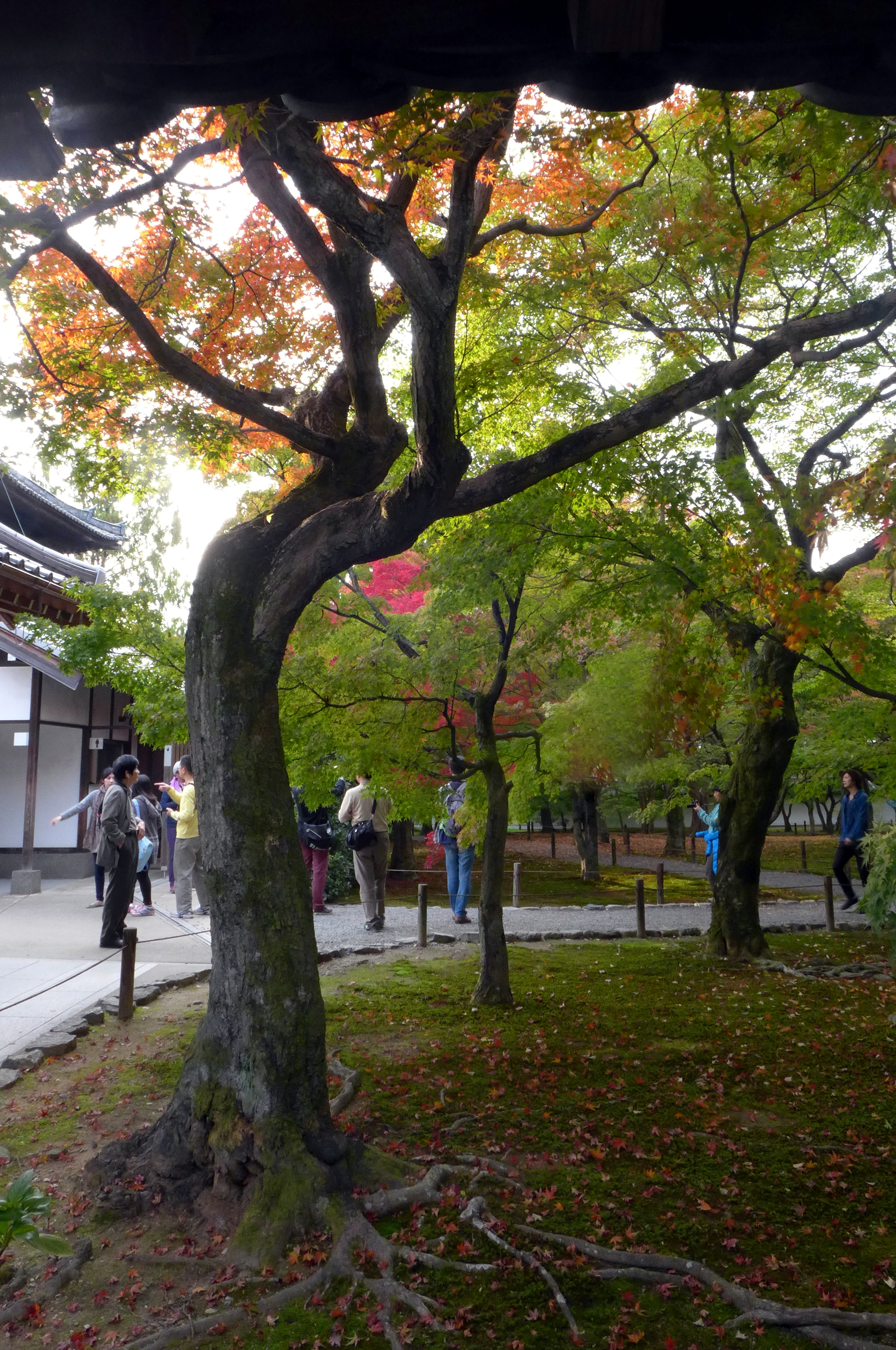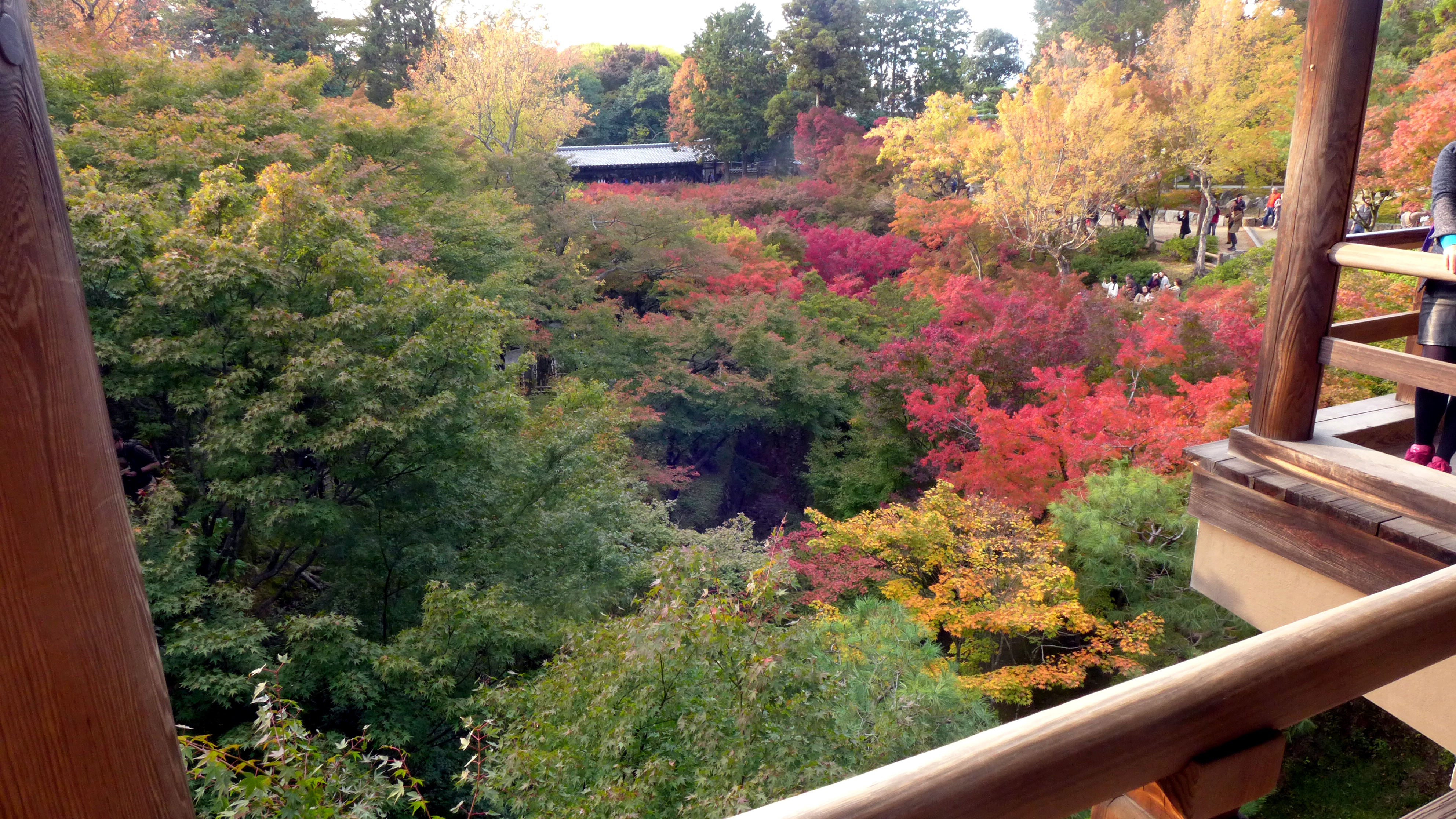 The platform was pretty busy (pretty much everyone from Kyoto comes to see the koyo at the famous temples) but its wide enough for everyone to take a good picture. Once you leave the platform you can walk down through the trees – the walkway is levels of stairs and paths all the way down to the stream that flows under the temple. Though it’s a short path its easy to spend ages here just looking at the trees surrounding you. I was behind a couple dressed in kimono and yukata, enjoying the koyo in traditional Japanese dress – an anachronistic image that reminded me that people have been visiting Tofuku-ji to see the koyo for centuries.