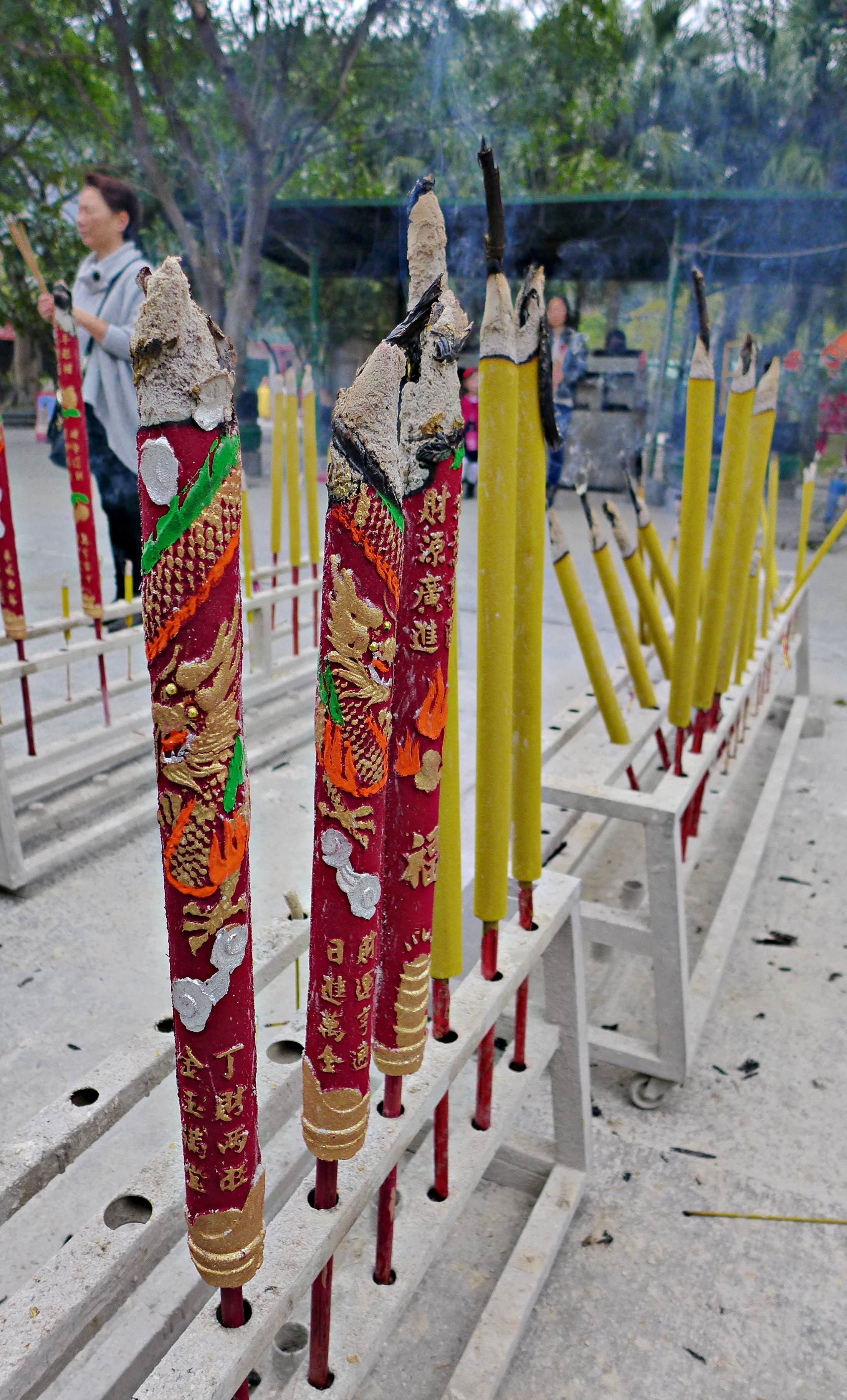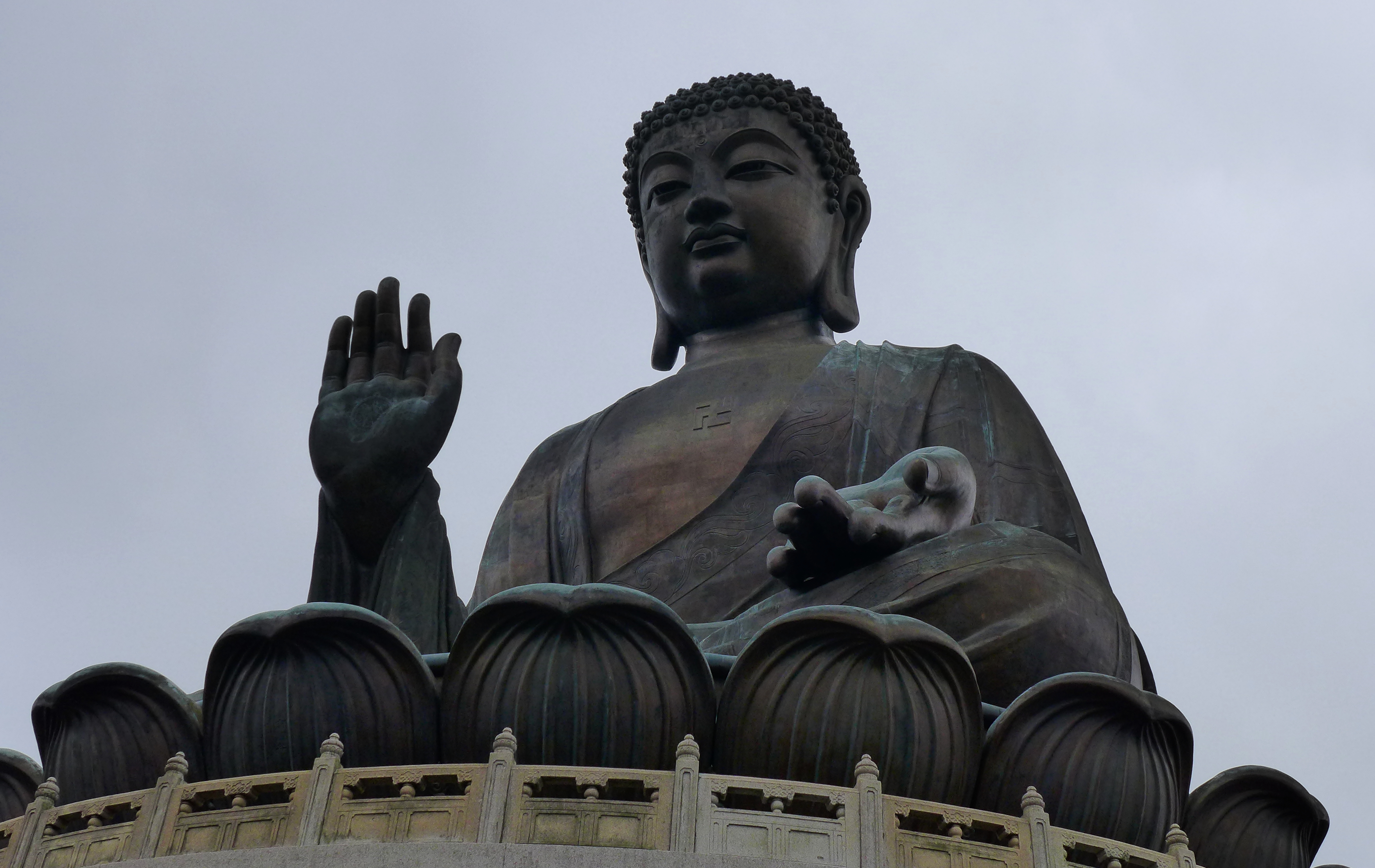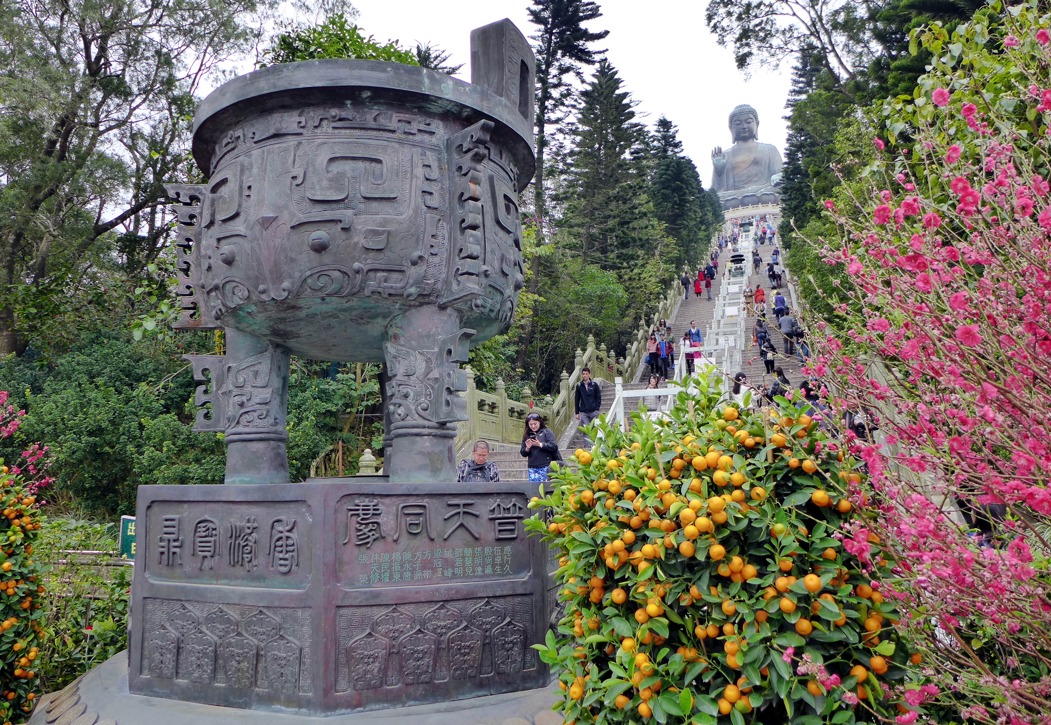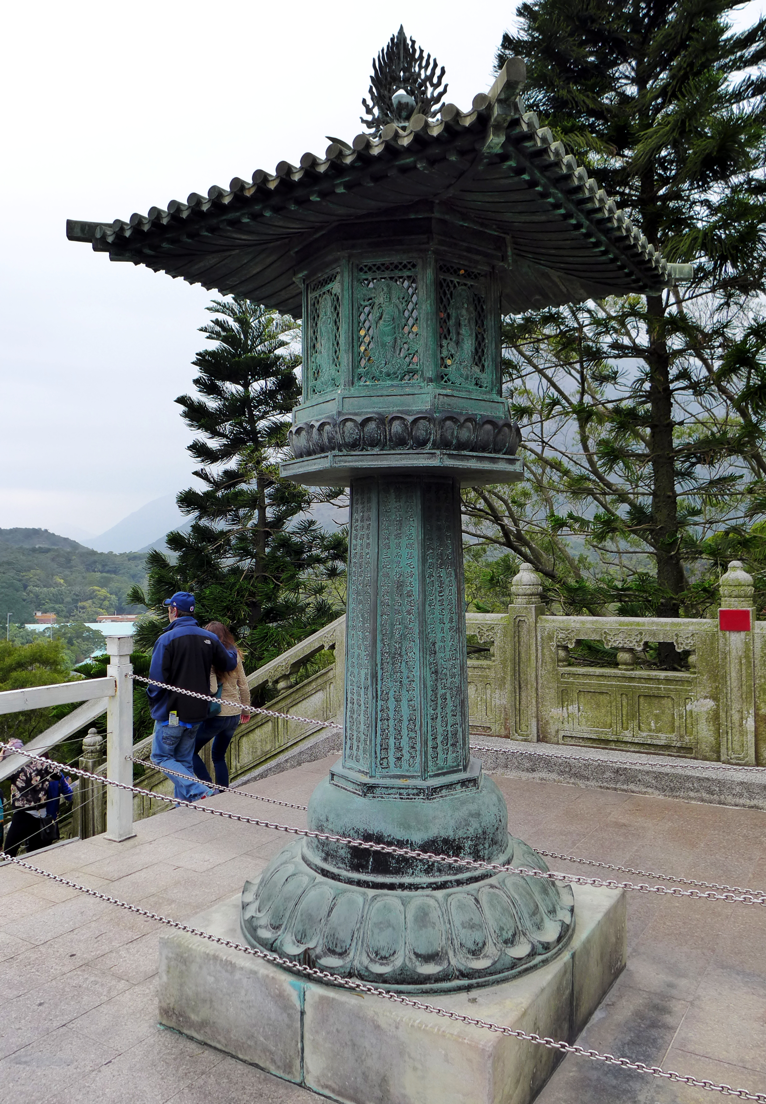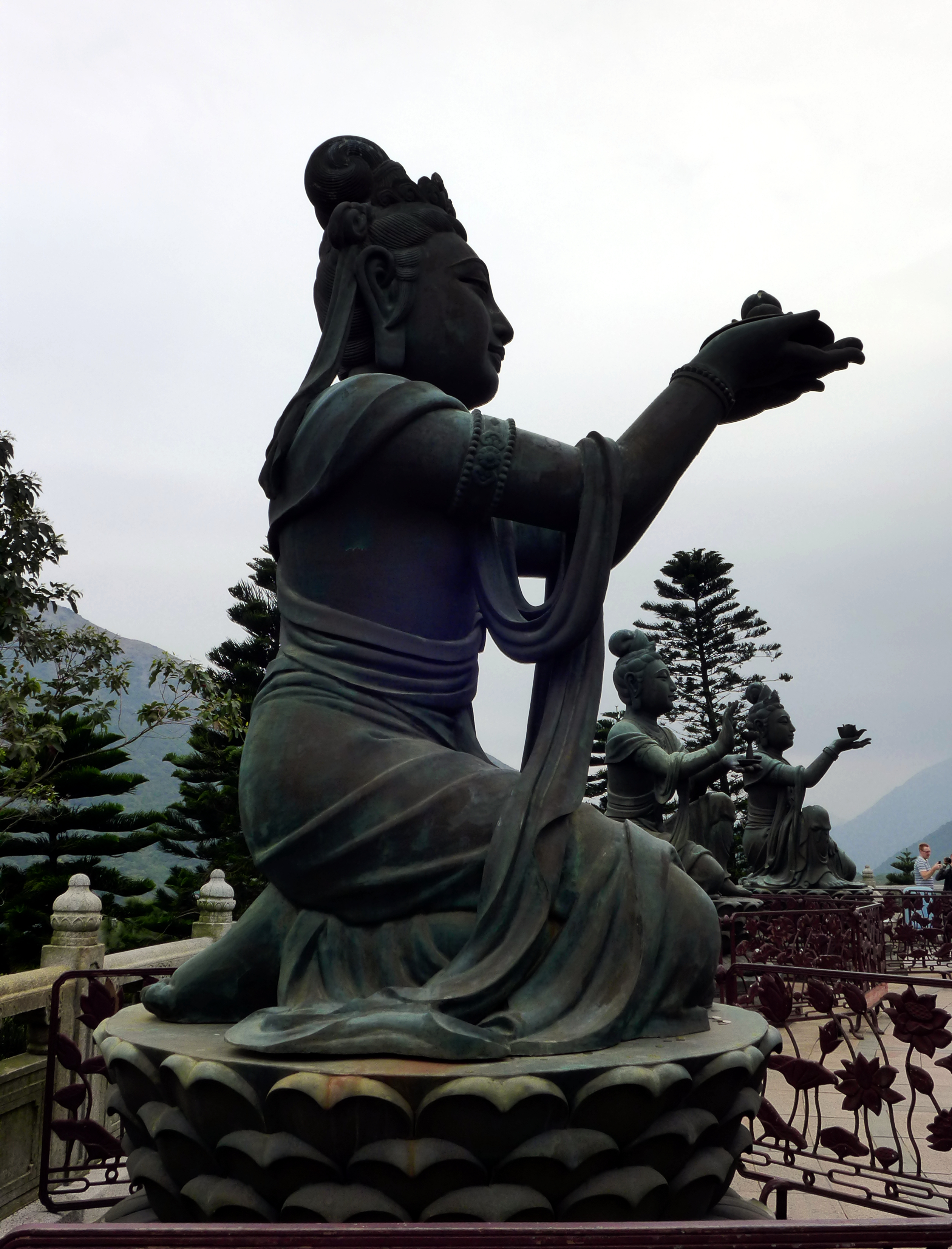 Once you’ve climbed the 268 steps up to the Buddha you can walk around and admire the (hazy) view of the Po Lin Monastery and surrounding mountains. The path around the Buddha features six Devas (spiritual beings that are not gods but better than humans, a little like the Japanese kami) that are offering the Buddha flowers, incense, a lamp, ointment, fruit and music. These represent the things necessary to enter nirvana, symbolising charity, morality, patience, zeal, meditation and wisdom.