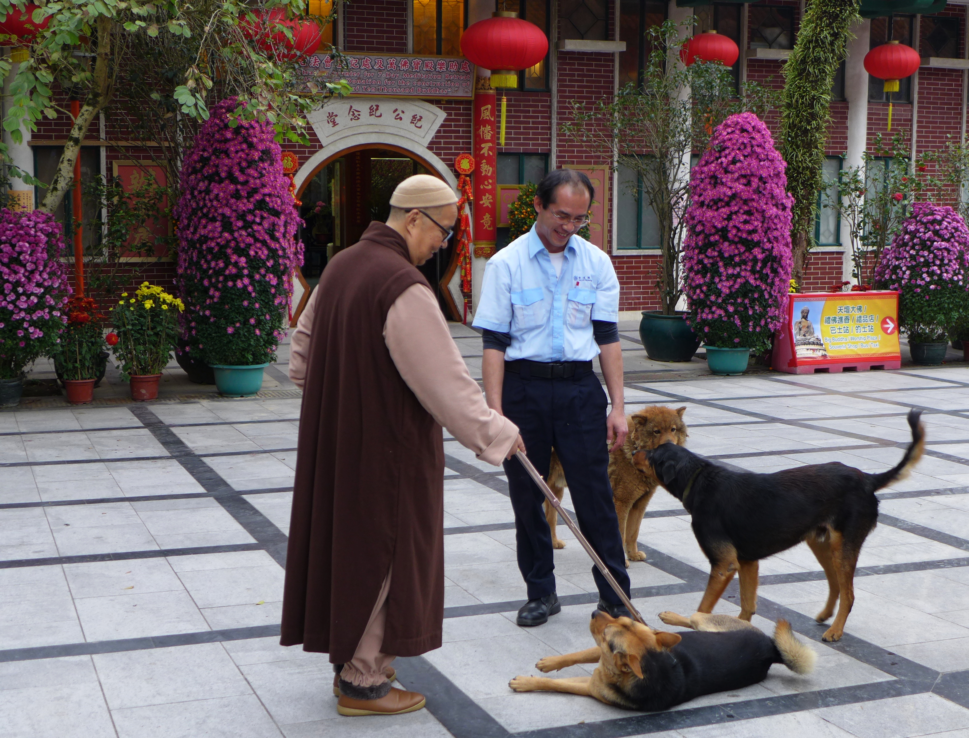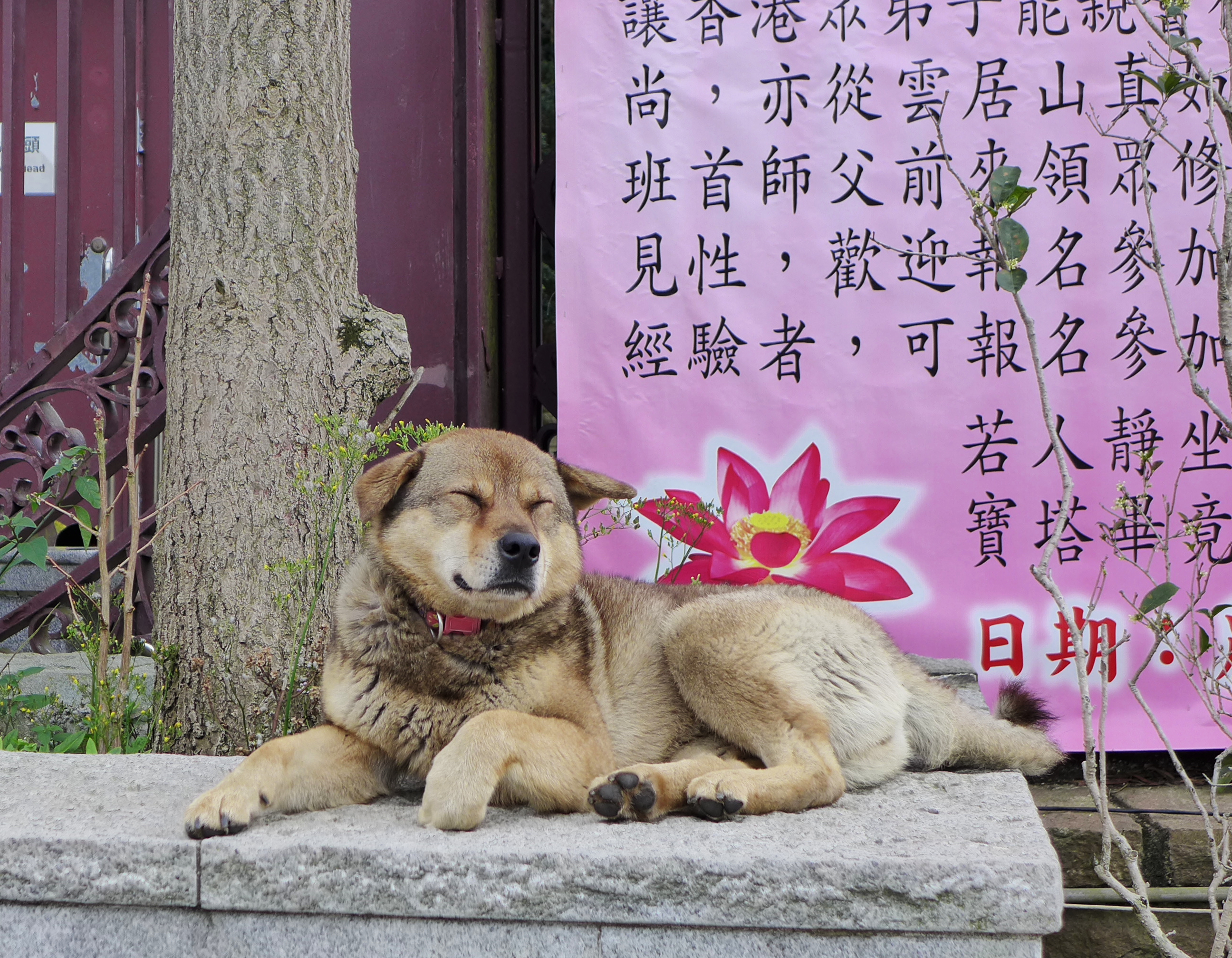 Past the generals we got a good look at the plaza at the bottom of the Buddha’s hill, which featured a dais with coloured flags and some dogs looking for food. I thought they were stray at first but I think they belong to the monastery and they were trying their luck at getting a bonus dinner.