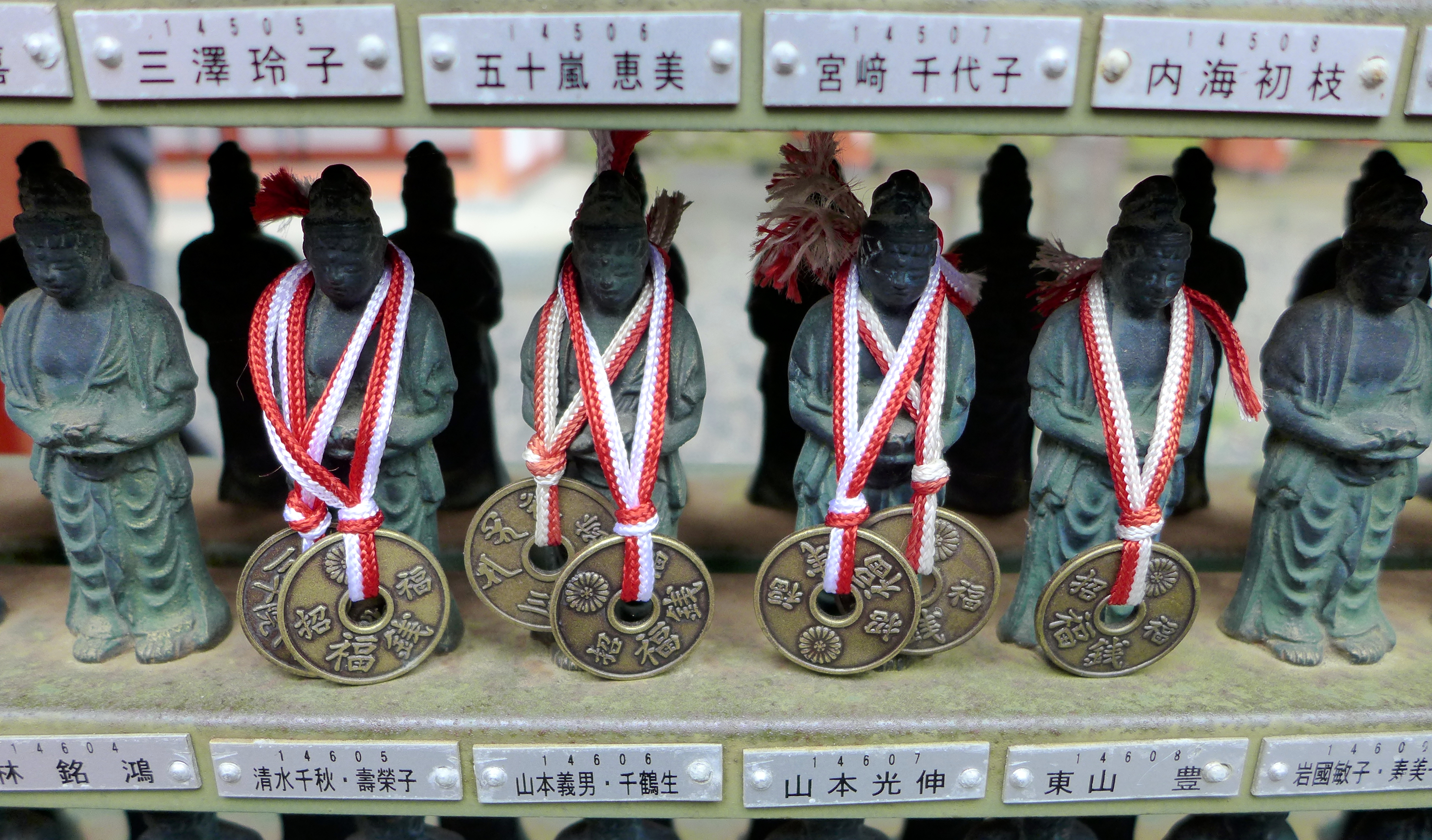 At the top of the temple there were racks of small figurines of Kannon, goddess of mercy, that had been donated by worshippers. I think that this is in order to gain good Karma or attain steps towards enlightenment. Some people had added extra charms to their statues, I assume in order to improve their luck.