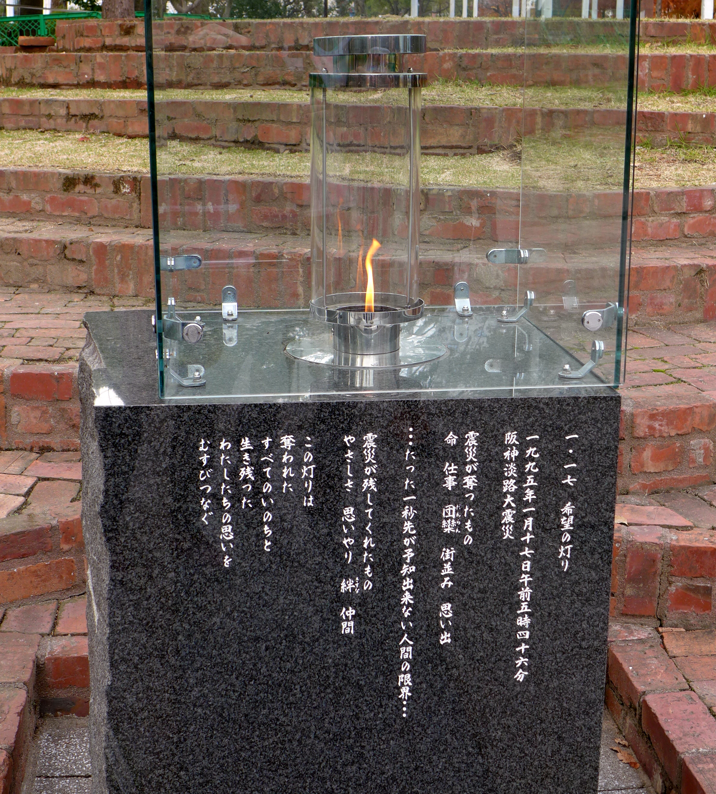 We passed by a memorial to the Great Hansin Earthquake of 1995, which was a 7.2 on the Richter scale. This earthquake killed 6,435 people and left over 200,000 people homeless. Bear in mind that this in Japan, a first world country. A country that is acutely aware of earthquakes, has bendy buildings and evacuation procedures – these figures show how astonishing and terrible power of nature really is. The poem attached to the memorial flame reads thus (in English):