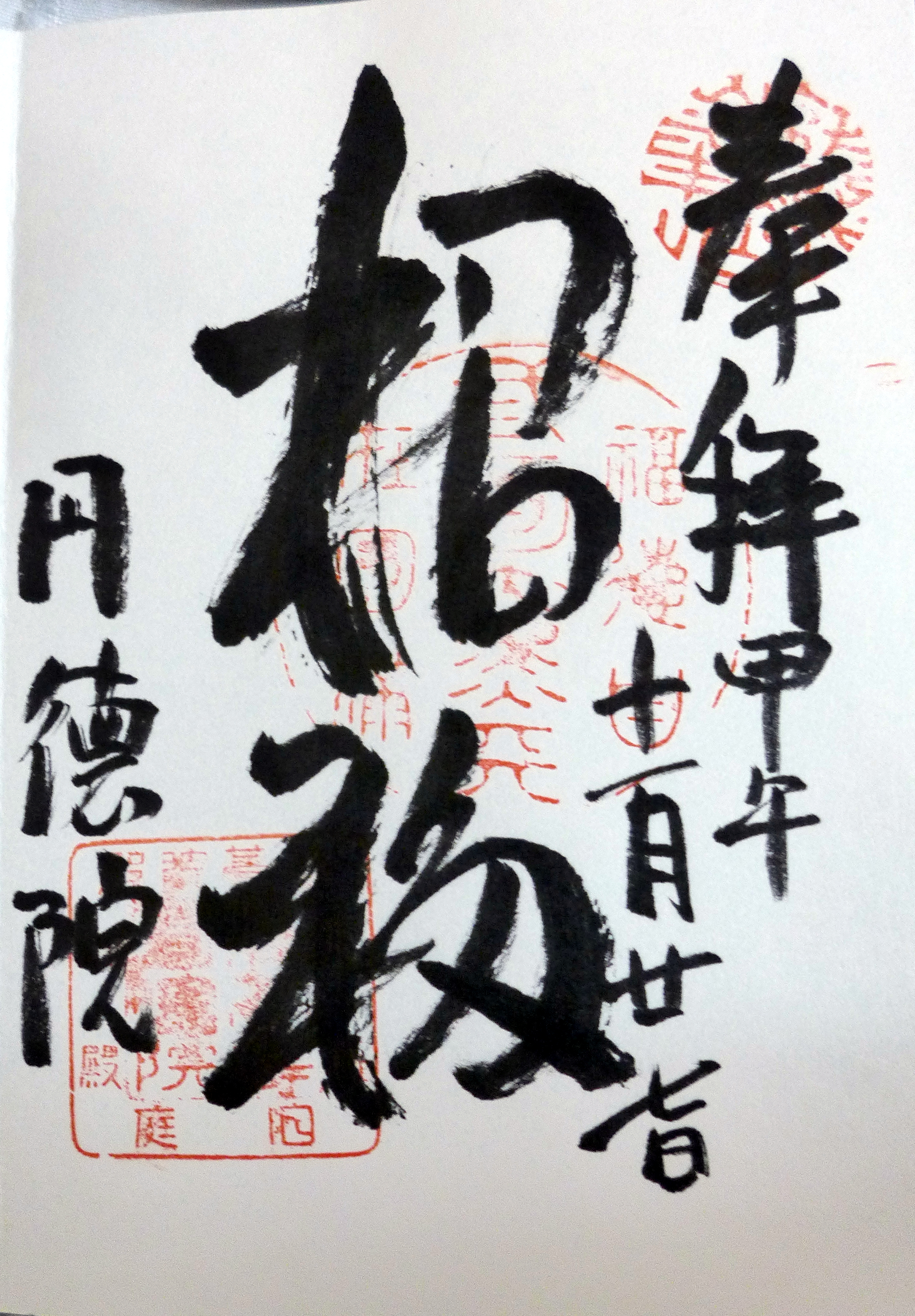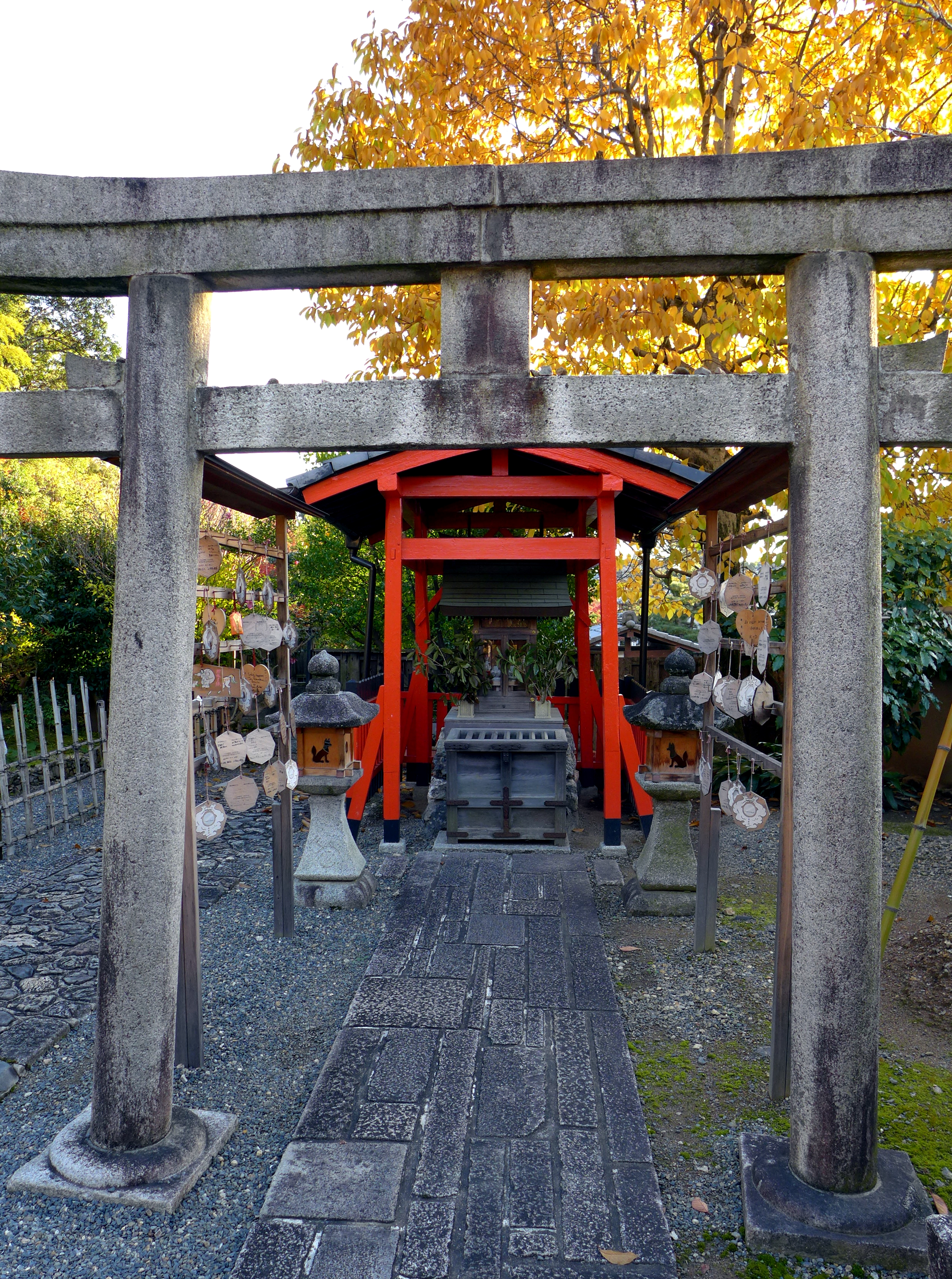This small shrine is opposite Heian Jingu, and I don’t think it gets many visitors as everyone wants to see Heian Jingu instead. I decided to go in and have a look because I think even small shrines are interesting to look around. This is one of the many sub-temples dedicated to Inari, the god of foxes and rice (the god of Fushimi Inari). The temple did have a Shuin so I got my book stamped. As it is a smaller temple the stamp is very simple – just the name of the shrine, the word ‘worship’ and the date – no fancy calligraphy but still nice to remember the shrine.