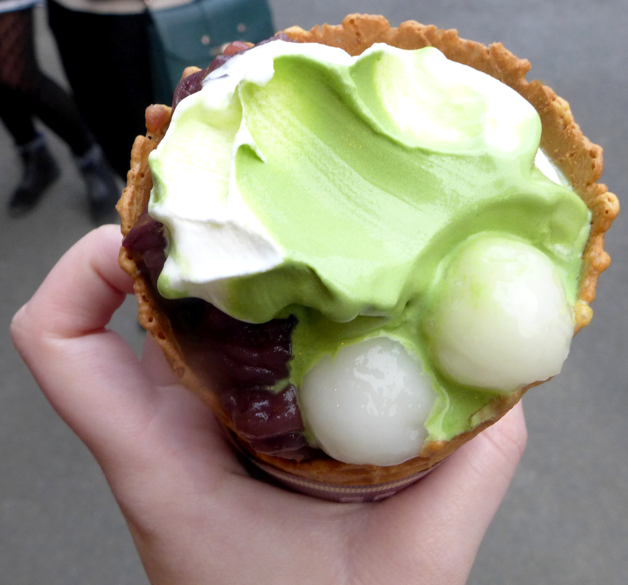 In japan areas and towns tend to become famous for a local specialty food. Uji’s is all things matcha (抹茶). Matcha is finely ground green tea and is featured in the Japanese tea ceremony. The street leading up to Byodo-in was lined with shops selling matcha flavoured ice-cream, cake and sweets among other things. One shop was roasting matcha and the smell permeated half the street. Obviously I had to get something so I got a vanilla and matcha ice cream which came with sweet beans and dango, which are sweet dumplings made out of rice flour. It was delicious. I forgot to take a picture before I attacked it because it looked so good.