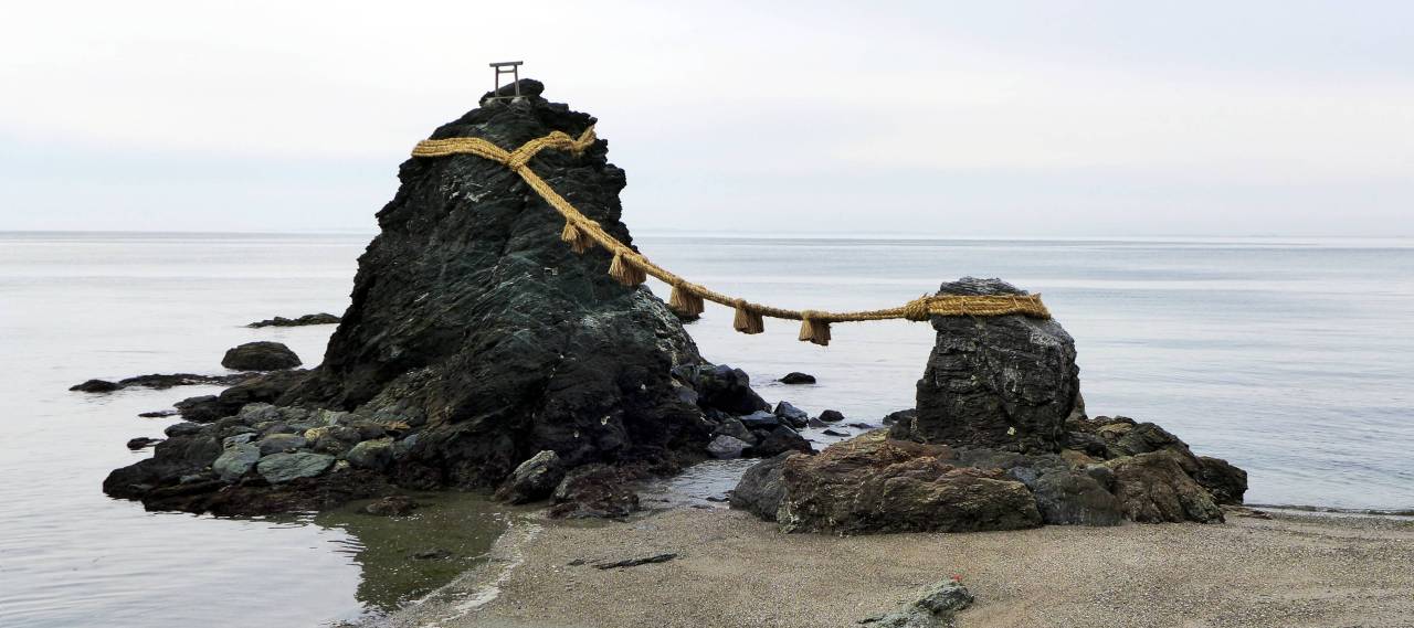 The two rocks are still married despite the falling out between Izanami and Izanagi, showing the eternity of their bond. The two rocks are bound by a huge shimenawa, a sacred rope made of rice straw, which is replaced several times a year due to its sheer weight (it weighs over a ton). The rocks are considered a shintai, a vessel for kami to inhabit. In Japan many things are considered shintai, including ancient trees and Mt Fuji. The top ranking Sumo champion is also considered a vessel for kami and wears a shimenawa before his matches to keep him pure. Yes, if you get that good at Sumo you are considered a living god, not even something the Emperor is allowed to claim any more (this was banned by the US after WWII).